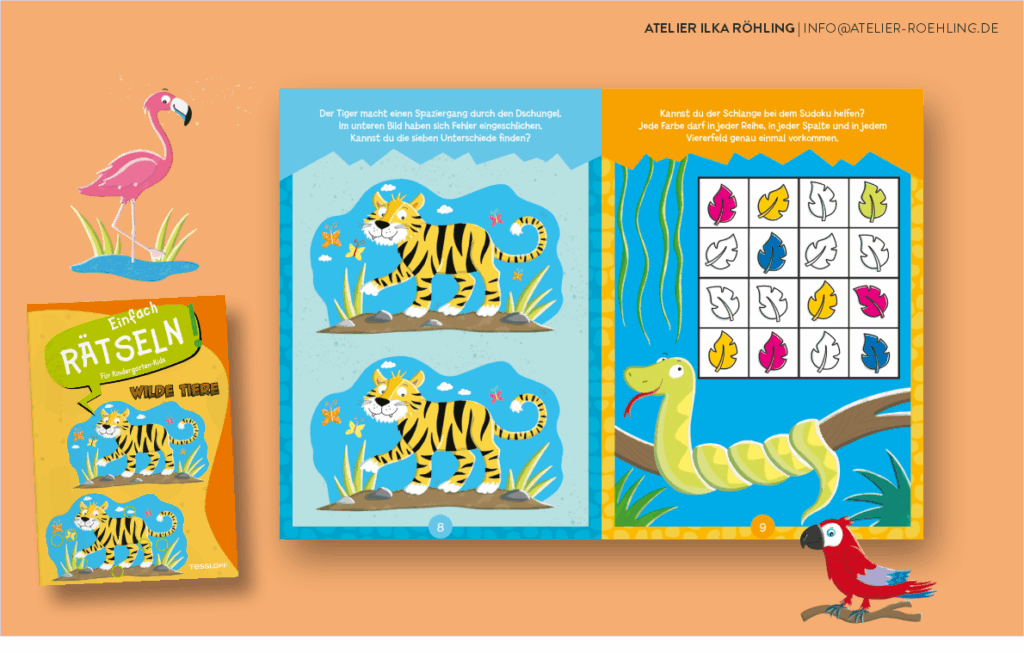 Alle Rätsel sind so einfach und farbenfroh gestaltet, dass Kindergartenkinder spielerisch rätseln können. Neben Tigern, Schlangen und Flamingos findet man u.a. auch Erdmännchen und Ameisenbären.